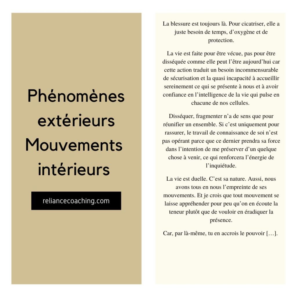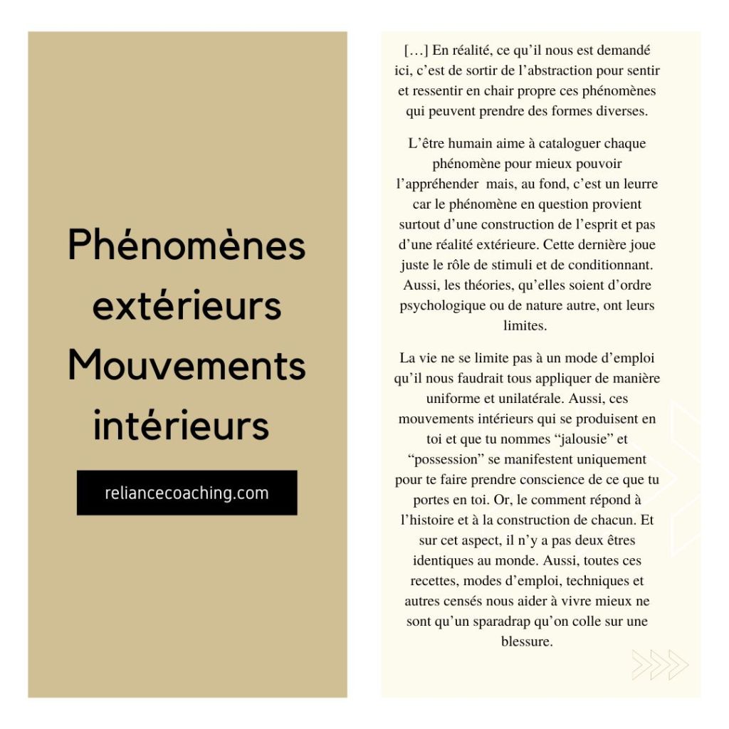 L’extérieur nous permet de saisir les mouvements qui se produisent dans notre intériorité. Ainsi, nous avons la possibilité de pouvoir diriger le focus de notre attention sur ces mouvements afin de pouvoir en saisir la tonalité, la teneur, la texture, le contenu, le degré d’intensité, la fréquence et nous saisir du message qu’ils contiennent.
