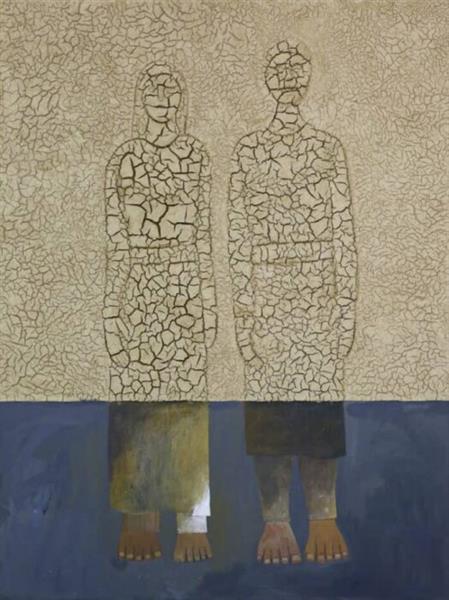 Ce tableau reflète, dans les variations qu’il contient, bien des attentes/idéaux du peintre qui se trouvent moulés dans la nature de la vision qu’il a, au moment de l’acte créateur, de certains thèmes qui sont alors retranscrits au plus près de ce qui en est vécu et/ou ressenti. Ici, ce sont les thèmes de la perte, d’une forme d’exil, d’une forme d’arrachement à ses terres et à sa culture d’origine, de l’identité perdue/bafouée qui se disent à travers une présence qui se craquèle dans l’aridité de l’absence originelle. Une présence qui n’est plus habitée que par le foyer d’une certaine forme de manque à être et qui, en même temps, par ce revers, témoigne du lien indéfectible avec la source première de toute vie. C’est ainsi que la représentation qui en émane et qui s’affiche sous la forme d’une démarcation, d’un séparateur entre deux territoires se fait en même temps et à la fois le berceau et le pont entre l’originel et l’Ailleurs ; entre la Mémoire et la vivance ; entre le Nom et le sens de l’identité ; entre l’unité et la fragmentation sans exclure l’un au profit de l’autre mais en faisant du spectre d’une origine vilipendée le témoin de la force et de la puissance de l’attachement à la nature de sa souche.